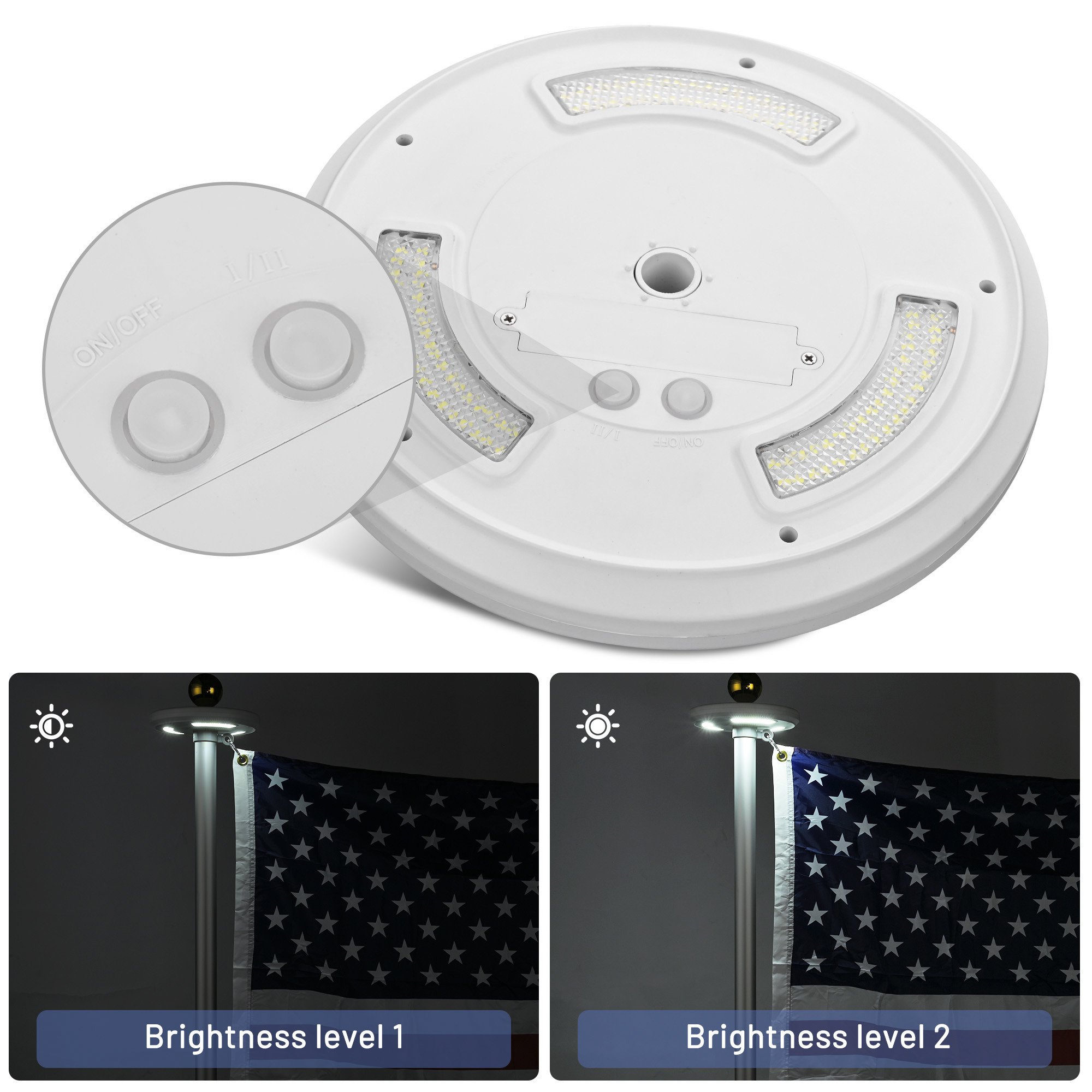 - Automatic On/Off - With light sensor; the flagpole light automatically turns on during the night or in the dark environment; automatically switches off and charges during daytime; 2 levels brightness allows you to adjust brightness level according to your need